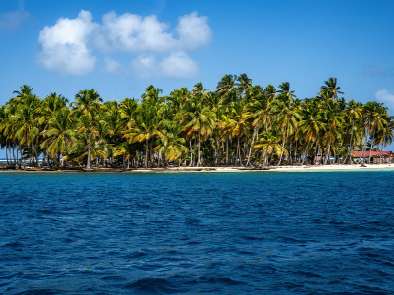 Island surrounded by clear, blue water, in the San Blas Islands, Panama